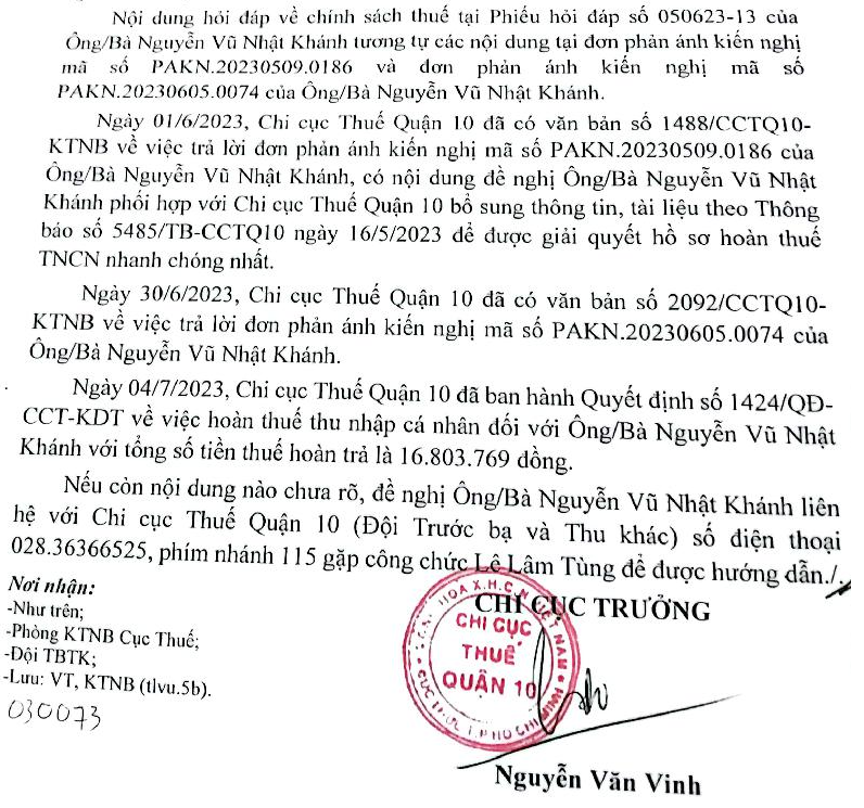 - Ngày 19/5/2023 tôi có gửi bản giải trình qua bưu điện đồng thời gửi trên hê thống thuế điện tử. Thế nhưng cho đến nay tôi vẫn chưa nhận được số tiền hoàn thuế TNCN được xác nhận theo thông báo nêu trên.