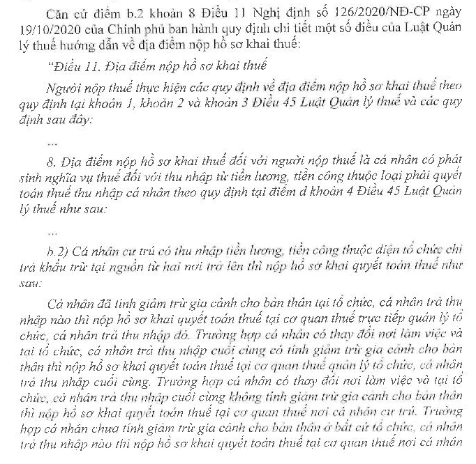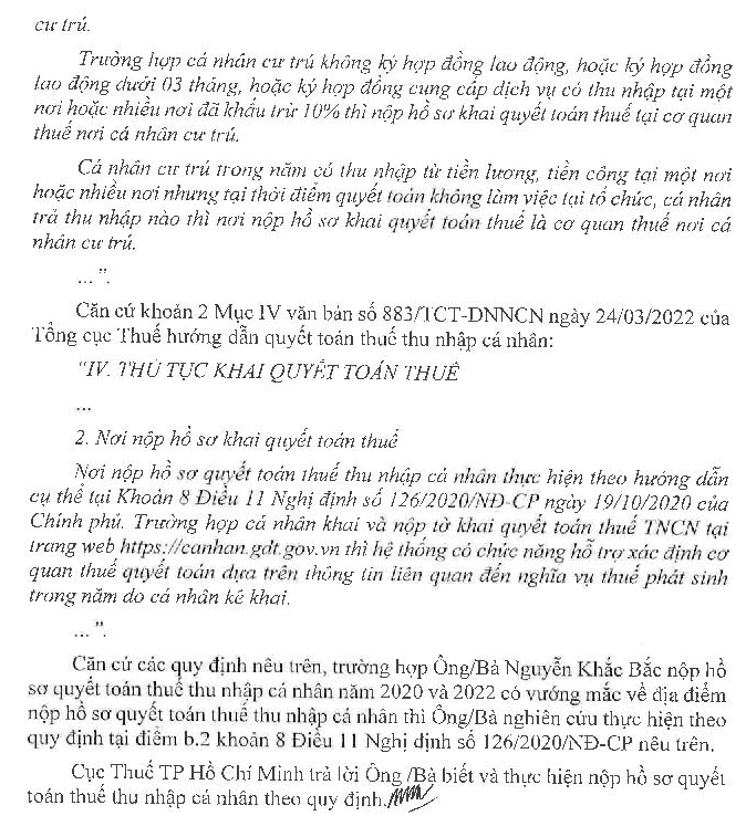 Kính gửi: Tổng Cục Thuế Tôi có MST 8462003627 Tôi đang gặp khó khăn trong quá trình quyết toán thuế TNCN các năm 2020 và 2022, xin trình bày như sau: Từ 09/2023 đến nay, tôi đang làm việc tại công ty X, quản lý bởi Cục Thuế TP Hồ Chí Minh. Về việc quyết toán thuế tncn các năm 2020 Năm 2020, tôi làm việc tại 02 công ty: + Công ty A: từ tháng 01-08/2020 + Công ty B: từ 08/2020 – 11/2021, quản lý bởi Cục Thuế Tỉnh TT-Huế. Tháng 4/2024, tôi đã gửi hồ sơ đề nghị hoàn thuế năm 2020 tới Cục Thuế tỉnh TT Huế và nhận được thông báo không chấp nhận do NNT nộp sai CQT và sau đó tháng 11/2024 cán bộ Cục Thuế Tỉnh TT-Huế hướng dẫn tôi nộp hồ sơ hoàn thuế năm 2020 tới Cục Thuế TP Hồ Chí Minh. Tiếp theo, ngày 08/11/2024 tôi nộp hồ sơ tới Cục Thuế TP Hồ Chí Minh (Mã gd điện tử: 11020240018532611). Tuy nhiên ngày 18/11/2024 tôi nhận được thông báo không chấp nhận Hồ sơ với lý do “Người nộp thuế không thuộc đối tượng QTT tại Cục thuế TP Hồ Chí Minh”. Về việc quyết toán thuế tncn các năm 2022 Năm 2022, tôi làm việc tại 02 công ty: + Công ty C: từ tháng 11/2021 – 07/2022 + Công ty D: từ tháng 07/2022 – 04/2023, quản lý bởi Chi cục Thuế Quận Phú Nhuận, TP. HCM. Ngày 07/6/2024, tôi đã gửi hồ sơ đề nghị hoàn thuế năm 2022 tới Chi cục thuế Quận Gò Vấp (nơi mà tôi đang tạm trú) và nhận được thông báo không chấp nhận với lý do “NNT đang thực hiện giảm trừ gia cảnh tại CÔNG TY X (công ty mà tôi đang làm việc). Do đó NNT nộp hồ sơ khai quyết toán thuế tại cơ quan thuế quản lý trực tiếp nơi đang trả thu nhập. Căn cứ Điểm b.2 Khoản 8 Điều 11 Nghị định số 126/2020/NĐ-CP ngày 19/10/2020 của Chính phủ, căn cứ dữ liệu từ hệ thống quản lý thuế tập trung(TMS). Ông(bà) không thuộc trường hợp kê khai quyết toán thuế TNCN năm 2022 tại chi cục thuế quận Gò Vấp”. Tiếp theo, ngày 18/10/2024 tôi nộp hồ sơ tới Cục Thuế TP Hồ Chí Minh (Mã gd điện tử: 11020240017827832). Tuy nhiên ngày 15/11/2024 tôi nhận được thông báo không chấp nhận Hồ sơ với lý do “Người nộp thuế nộp sai cơ quan thuế”. Tôi cũng đã cố gắng liên hệ Cục Thuế Thành phố Hồ Chí Minh qua số điện thoại công khai là 028.37702288 nhưng không thể liên hệ được. Do đó kính nhờ Tổng Cục Thuế hỗ trợ kiểm tra trường hợp của tôi và hướng dẫn tôi nộp đúng cơ quan thuế năm 2020 và năm 2022. Xin cám ơn và trân trọng.