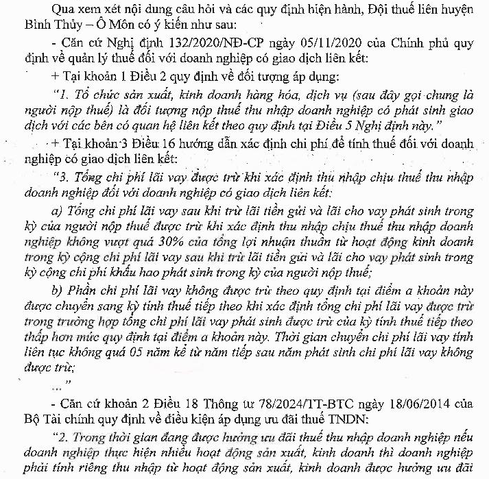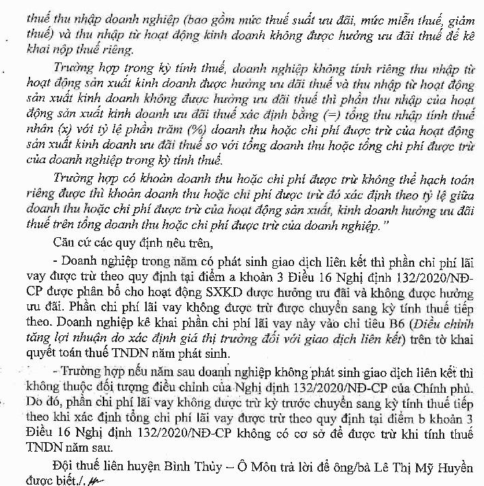 Kính gửi Bộ Tài Chính, cho tôi hỏi về việc phân bổ chi phí lãi vay còn lại sau khi bị dính giao dịch liên kết đối với công ty vừa có hoạt động ưu đãi và không ưu đãi thuế. Ví dụ minh họa: Giả sử doanh nghiệp có chi phí lãi vay là 5 tỷ đồng, dính giao dịch liên kết. Chi phí lãi vay được tính trong kỳ là 3 tỷ, chi phí lãi vay bị loại trong kỳ là 2 tỷ. Trong đó: + Doanh thu ưu đãi thuế là: 4 tỷ, giá vốn: 1 tỷ + Doanh thu không ưu đãi thuế là: 6 tỷ, giá vốn: 2 tỷ Theo phương pháp thông thường khi không dính GDLK, doanh nghiệp phân bổ chi phí lãi vay để tính chi phí cho từng loại hình được tính theo tỷ lệ doanh thu như sau: Chi phí lãi vay của HĐ ưu đãi thuế = 5 tỷ x ( 4 tỷ : 10 tỷ) = 2 tỷ Chi phí lãi vay của HĐ không ưu đãi thuế = 5 tỷ x ( 6 tỷ : 10 tỷ) = 3 tỷ => Tính được chi phí tính thuế của từng loại hình doanh thu: + Chi phí tính thuế của DT ưu đãi = GV + CPLV = 1 tỷ + 2 tỷ = 3 tỷ. Doanh thu ưu đãi được miễn thuế 100% nên lợi nhuận = Doanh thu - CP = 4 tỷ - 3 tỷ = 1 tỷ được miễn 100% thuế TNDN. Vậy khi bị dính giao dịch liên kết, đối với phần chi phí lãi vay bị loại doanh nghiệp cũng phân bổ chi phí còn lại sau khi bị loại theo tỷ lệ doanh thu không? Khi CPLV trong kỳ bị loại 2 tỷ, chi phí lãi vay thực tế còn được khấu trừ trong kỳ là 3 tỷ Chi phí lãi vay của HĐ ưu đãi thuế = 3 tỷ x ( 4 tỷ : 10 tỷ) = 1 tỷ 2 Chi phí lãi vay của HĐ không ưu đãi thuế = 3 tỷ x ( 6 tỷ : 10 tỷ) = 1 tỷ 8 + Chi phí tính thuế của DT ưu đãi = GV + CPLV = 1 tỷ + 1 tỷ 2 = 2 tỷ 2. Doanh thu ưu đãi được miễn thuế 100% nên lợi nhuận = Doanh thu - CP = 4 tỷ - 2 tỷ 2 = 1 tỷ 8 được miễn 100% thuế TNDN. Trường hợp đặt ra, nếu doanh nghiệp áp dụng theo phương án phân bổ chi phí lãi vay ban đầu là 5 tỷ đồng, thì chi phí lãi vay bị loại điền vào chỉ tiêu [B6] là: 2 tỷ đồng vậy thực tế chi phí lãi vay của HĐ không ưu đãi thuế chỉ được khấu trừ trong kỳ là 1 tỷ đồng. Trường hợp doanh nghiệp áp dụng theo phương án phân bổ chi phí lãi vay đã trừ phần loại CPLV dính GDLK là 3 tỷ đồng, vậy nếu năm sau doanh nghiệp không dính GDLK thì phần chi phí lãi vay còn được khấu trừ doanh nghiệp phân bổ cho từng loại hình ưu đãi đúng không? Doanh thu ưu đãi doanh nghiệp được cộng thêm 800tr khi tính CP tính thuế, còn doanh thu không ưu đãi thì điền vào chỉ tiêu [b11] 1 tỷ 2? Kính mong nhận được sự phản hồi từ Bộ tài chính!