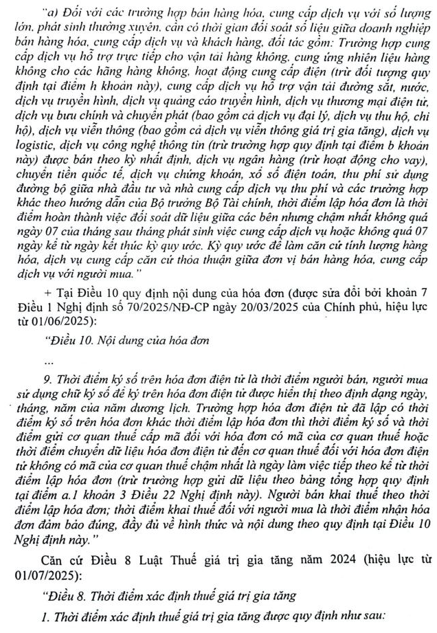 Công ty LARION - Mã số thuế 0303129210 Theo Điểm b Khoản 6 Điều 1 Nghị định 70/2025/NĐ-CP có hướng dẫn: "Thời điểm lập hóa đơn là thời điểm hoàn thành việc đối soát dữ liệu giữa các bên nhưng không chậm quá ngày 07 của tháng sau tháng phát sinh việc cung cấp dịch vụ". Và theo Điểm c Khoản 7 Điều 1 Nghị định 70/2025/NĐ-CP: "Trường hợp hóa đơn điện tử đã lập có thời điểm ký số trên hóa đơn khác thời điểm lập hóa đơn thì thời điểm ký số và thời điểm gửi cơ quan thuế cấp mã đối với hóa đơn có mã của cơ quan thuế hoặc thời điểm chuyển dữ liệu hóa đơn điện tử đến cơ quan thuế đối với hóa đơn điện tử không có mã của cơ quan thuế chậm nhất là ngày làm việc tiếp theo kể từ thời điểm lập hóa đơn" Công ty tôi thuộc trường hợp cung cấp dịch vụ cần có thời gian đối soát số liệu giữa doanh nghiệp cung cấp cấp dịch vụ và khách hàng hàng tháng. Xin Bộ Tài Chính tư vấn giúp: + Công ty tôi cung cấp khối lượng dịch vụ cho khách hàng trong tháng 07/2025, hai bên đã đối soát và hoàn thành công việc đối soát ngày 07/08/2025. Như vậy Công ty tôi lập hóa đơn vào ngày 07/08/2025, ký số và gởi cơ quan thuế cấp mã ngày 08/08/2025 có được xem là hợp lệ ? + Trên hóa đơn lập ngày 07/08/2025 và ký số gởi cơ quan thuế cấp mã ngày 08/08/2025 này. Công ty tôi ghi nội dung “Hoàn thành bàn giao dịch vụ tháng 07/2025 theo Biên bản đối soát tháng 7/2025 của Hợp đồng XYZ” và Công ty tôi ghi nhận hạch toán doanh thu, kê khai thuế GTGT trong kỳ tháng 07/2025 có được xem là hợp lệ (Công ty thuộc diện kê khai thuế GTGT hàng tháng) ? Hay là Công ty phải ghi nhận doanh thu, kê khai thuế GTGT trong kỳ tháng 08/2025 (?)