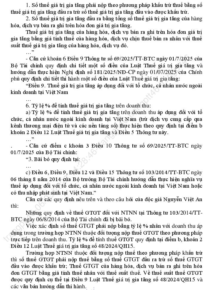 Kính gửi Cơ quan thuế, trong thông tư Số: 103/2014/TT-BTC hướng dẫn thực hiện nghĩa vụ thuế đối với nhà thầu nước ngoài có quy định: "số thuế GTGT phải nộp= Doanh thu tính thuế Giá trị gia tăng x Tỷ lệ % để tính thuế GTGT trên doanh thu" mà không đề cập đến thuế suất thuế GTGT. Vậy CQT cho tôi hỏi "Tỷ lệ % để tính thuế GTGT trên doanh thu" có phải là thuế suất thuế GTGT hay không. Và nếu ko thì thuế suất thuế GTGT theo thông tư này áp dụng cho từng ngành nghề là bao nhiêu. Và đến ngay, thông tư này có còn hiệu lực hay không và thuế suất thuế GTGT đang áp dụng cho từng ngành nghê cụ thể là bao nhiêu. Tôi xin cảm ơn