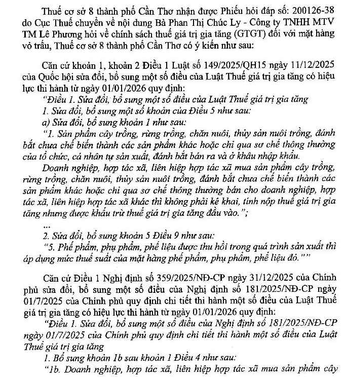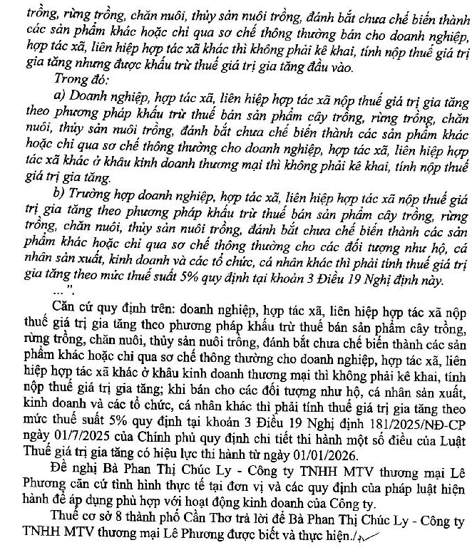 Kính gửi: Thuế cơ sở 8 Thành Phố Cần Thơ Tên Công ty: Công Ty TNHH MTV Thương Mại Lê Phương Địa chỉ: ấp Phương Qưới C, xã Phương Bình, TP. Cần Thơ Mã số thuế: 6300356720 Ngành hoạt động kinh doanh chính: Mua bán vỏ Trấu. Căn cứ theo Luật số: Luật số: 149/2025/QH15 có hiệu lực thi hành từ ngày 01 tháng 01 năm 2026 Sửa đổi, bổ sung một số điều của Luật Thuế giá trị gia tăng như sau: Điều 1. Sửa đổi, bổ sung một số điều của Luật Thuế giá trị gia tăng 1. Sửa đổi, bổ sung một số khoản của Điều 5 như sau: a) Sửa đổi, bổ sung khoản 1 như sau: “1. Sản phẩm cây trồng, rừng trồng, chăn nuôi, thủy sản nuôi trồng, đánh bắt chưa chế biến thành các sản phẩm khác hoặc chỉ qua sơ chế thông thường của tổ chức, cá nhân tự sản xuất, đánh bắt bán ra và ở khâu nhập khẩu. Doanh nghiệp, hợp tác xã, liên hiệp hợp tác xã mua sản phẩm cây trồng, rừng trồng, chăn nuôi, thủy sản nuôi trồng, đánh bắt chưa chế biến thành các sản phẩm khác hoặc chỉ qua sơ chế thông thường bán cho doanh nghiệp, hợp tác xã, liên hiệp hợp tác xã khác thì không phải kê khai, tính nộp thuế giá trị gia tăng nhưng được khấu trừ thuế giá trị gia tăng đầu vào.” Hiện nay, Công ty chúng tôi đang gặp khó khăn, vướng mắc trong việc xác định mặt hàng Trấu bán ra của Công ty có thuộc đối tượng không kê khai nộp thuế hay thuộc đối tượng chịu thuế GTGT, cũng như việc áp dụng mức thuế suất thuế GTGT phù hợp theo quy định hiện hành. Vì vậy, Công ty chúng tôi kính đề nghị Quý Cơ quan xem xét, hỗ trợ và có ý kiến xác nhận về việc áp dụng thuế GTGT đối với hoạt động kinh doanh của Công ty (thuộc đối tượng không kê khai nộp thuế hoặc chịu thuế GTGT với mức thuế suất cụ thể) để Công ty có cơ sở thực hiện kê khai, nộp thuế đúng quy định của pháp luật. Rất mong nhận được sự quan tâm, phản hồi sớm từ Quý Cơ quan. Công ty chúng tôi xin trân trọng cảm ơn!