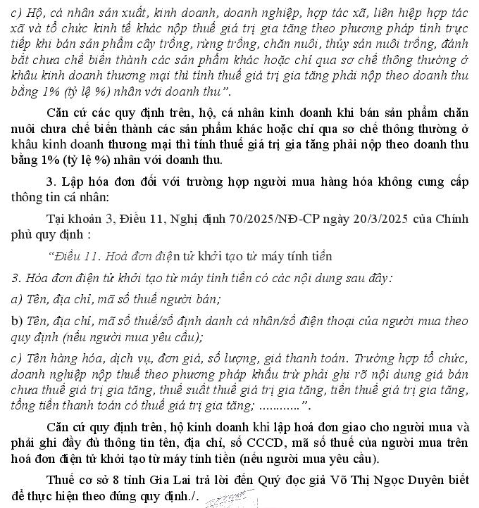 Hiện hộ kinh doanh của tôi đang hoạt động kinh doanh trong lĩnh vực mua bán heo hơi. Cụ thể: • Tôi mua heo hơi từ Công ty CP, trên hóa đơn giá trị gia tăng thể hiện mặt hàng heo hơi thuộc đối tượng không chịu thuế giá trị gia tăng. • Sau đó, tôi bán lại heo hơi nguyên con, chưa qua giết mổ, chưa qua chế biến cho các hộ kinh doanh khác. Vì vậy, tôi kính đề nghị Quý cơ quan hướng dẫn một số nội dung như sau: 1. Về thuế giá trị gia tăng: Trong trường hợp tôi mua và bán lại heo hơi nguyên con như trên, tôi có phải kê khai, nộp thuế giá trị gia tăng hay không? Nếu có cách tính như thế nào? 2.Về việc lập hóa đơn: Trong quá trình kinh doanh, tôi bán heo hơi nguyên con cho các hộ nhỏ lẻ. Tuy nhiên, một số trường hợp người mua không cung cấp đầy đủ thông tin cá nhân (không có căn cước công dân/mã số thuế), chỉ cung cấp tên. Kính đề nghị Quý cơ quan hướng dẫn: • Tôi có được phép lập hóa đơn bán hàng trong trường hợp này hay không? • Nếu được phép, thì thông tin người mua trên hóa đơn cần ghi như thế nào để đảm bảo đúng quy định? Kính mong Quý cơ quan xem xét và hướng dẫn để tôi thực hiện đúng quy định pháp luật về thuế.